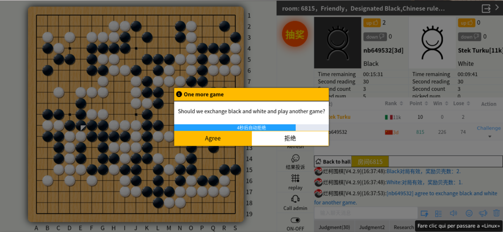 Basta cliccare sull’icona a destra e si entra nella partita. Per chiudere la partita/stanza si clicca sull’icona in alto a destra a forma di uscita (se si clicca sulla freccia stilizzata avremo invece la visualizzazione del solo goban con la partita in corso di svolgimento).