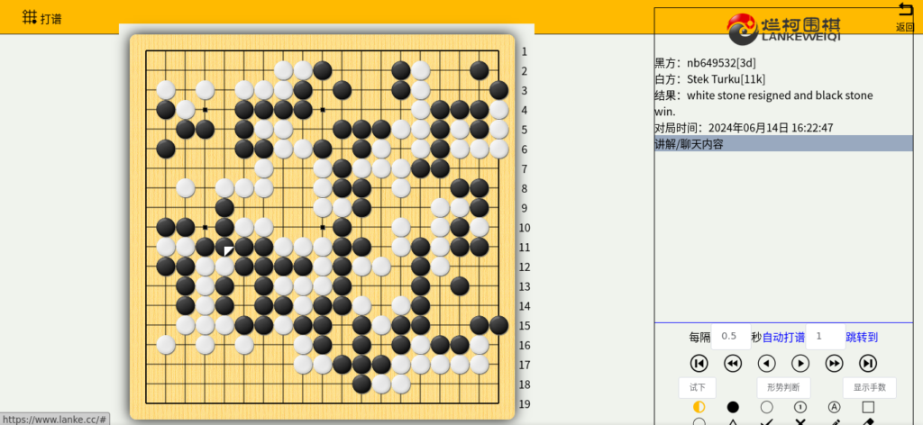 L’interruttore ON-OFF e’ relativa alle coordinate del goban. Abbiamo poi il tasto Judgement che valuta lo score, mentre Judgement2 e’ piu’ accurato ma e’ a “pagamento” (yubei/conchiglie). Stessa cosa per Research che immagino dia suggerimenti. E’ possibile da qui cosi’ come dalla singola partita recuperata dall’archivio fare il download dell’sgf.