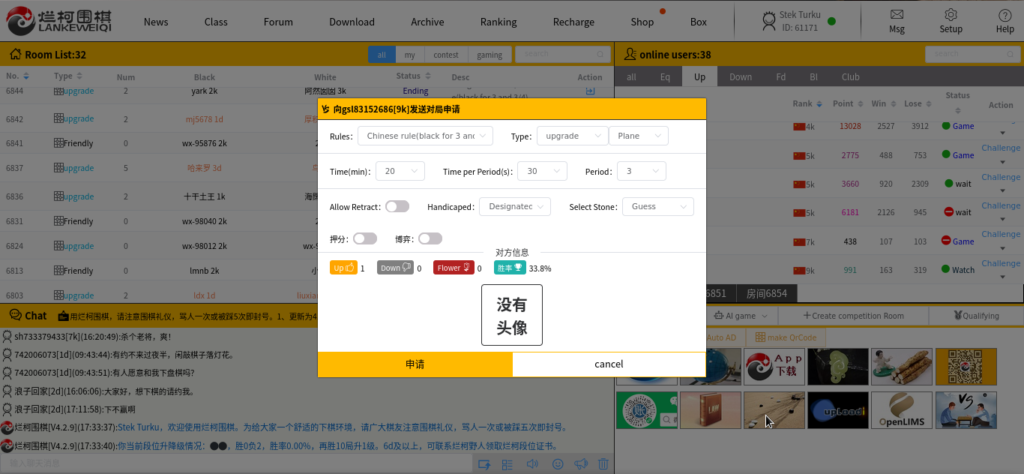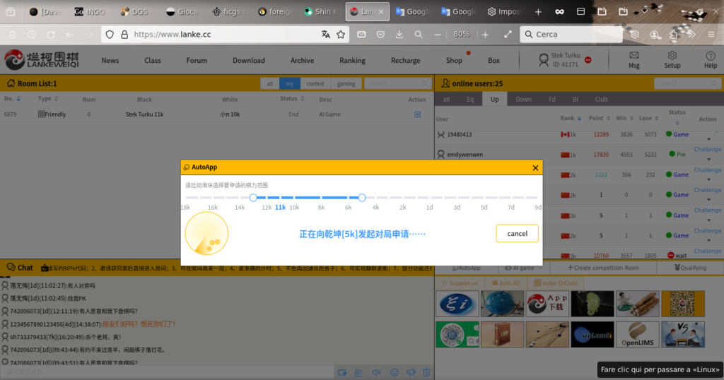 Una volta loggato con username e password abbiamo la classica UI con le partite, gli utenti e la chat (ci sono anche messaggi di servizio come ad esempio se qualcuno ti sfida!).