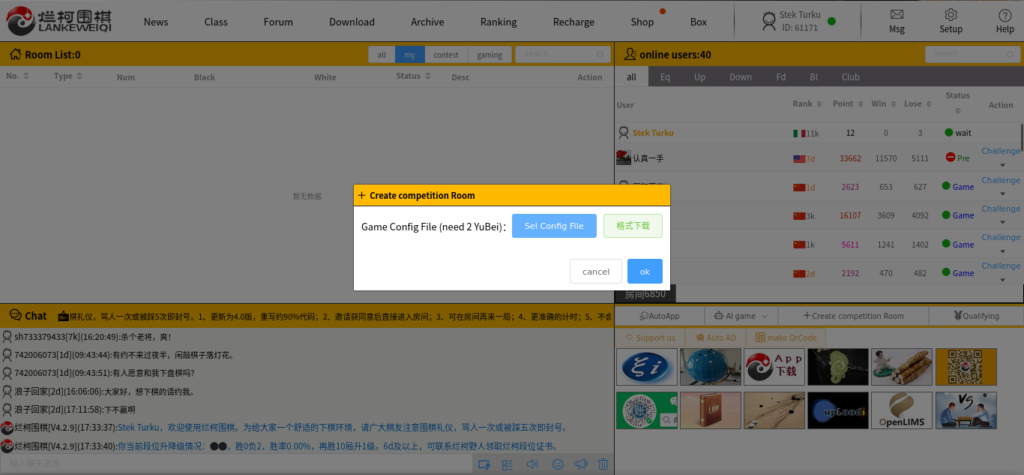 Infine abbiamo Create competition Room per creare, a pagamento, una stanza di torneo (?) con determinate impostazioni e anche gli utenti ammessi (si deve caricare un file di testo debitamente compilato di cui il server stesso te ne fa scaricare un template).