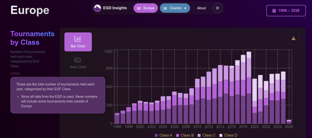 - Tornei per Classe: Vedere quanti tornei sono stati organizzati ogni anno, suddivisi per classe EGF (A, B o C, a seconda dell’importanza e dei tempi di riflessione).
