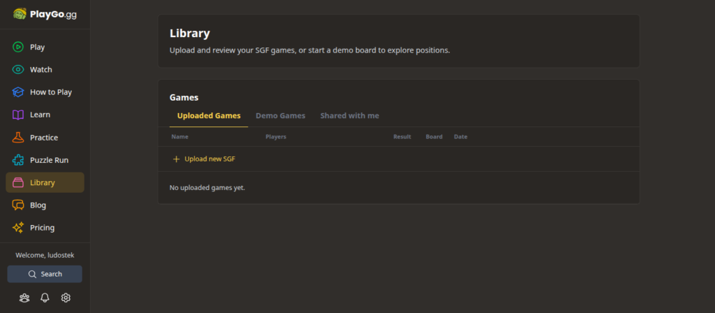 Nella sezione Library puoi infine caricare le tue partite (sgf), creare demo board o vedere le partite che qualcun altro utente sul sito puo’ aver condiviso con te.