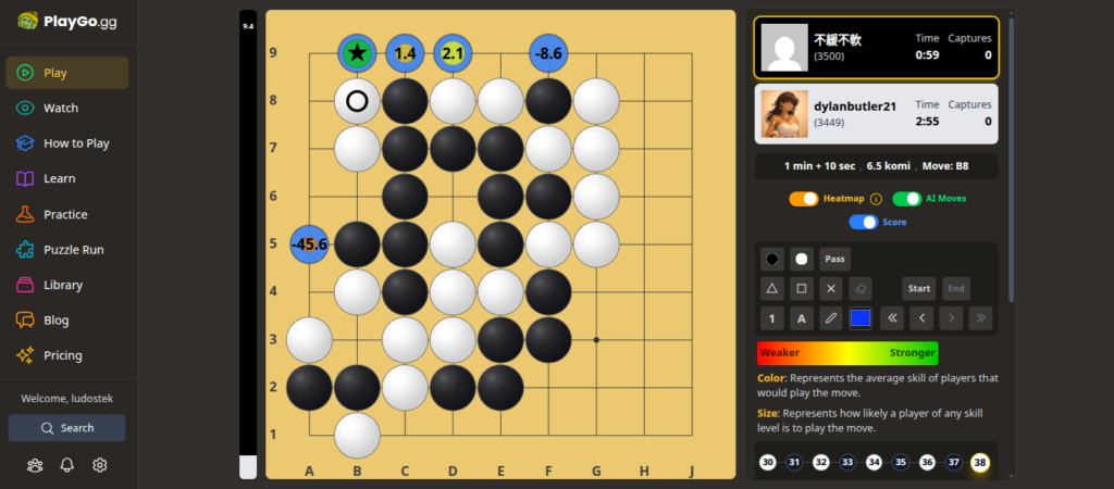 Uno dei punti di forza di PlayGo.gg e’ lo strumento AI Heat Map. Invece di mostrarti solo la mossa “perfetta” dell’intelligenza artificiale (che spesso e’ troppo complessa per un umano), la Heat Map evidenzia le zone del tabellone dove e’ piu’ sensato giocare in base al tuo livello.