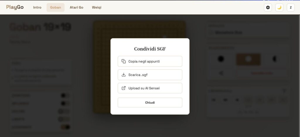 • Supporto AI e sgf: Con un click su “Condividi” puoi aprire la partita di AtariGo o di Weiqi, oppure la sequenza che hai disegnato su Goban, direttamente su AI sensei, o sulla tua AI locale (copi negli appunti e incolli in KaTrain, in Sabaki, etc…) o salvare SGF per un futuro utilizzo2.