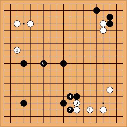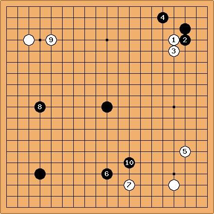 Shusai gioca solido per poter attaccare meglio, ma Go Seigen protegge subito e Shusai ne approfitta per ridurlo anche sull’altro lato. Anche 6 e’ una mossa inusuale, ma lavora perfettamente con la strategia del promettente cinese.
