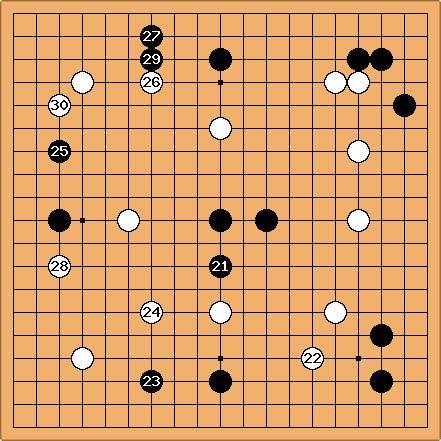 Dopo il Tengen, Seigen occupa un punto fondamentale di influenza. Kosugi cerca l’influenza sui lati per poter usare il Tengen, ma ancora una volta Go Seigen occupa i punti vitali per l’influenza.