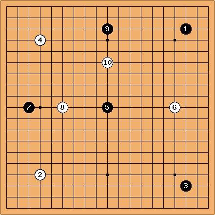 Come gia’ detto, l’apertura san-san, hoshi ed infine tengen fu una cosa mai vista, al punto che molti allievi di Shusai la ritennero offensiva. Questa apertura gioca molto sull’influenza soprattutto hoshi e tengen.