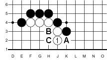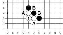 Adesso Bianco puo’ scendere con 1 oppure fare anche lui doppio hane, connettendo con B farebbe brutta forma. Bianco potrebbe pensare di fare la bocca della tigre con C, ma Nero darebbe subito atari, inducendo nuovamente Bianco a fare brutta forma. Al solito bianco puo’ decidere di dare atari prima di scegliere una di queste opzioni.