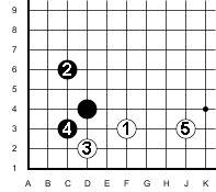 1 e’ l’approccio standard per il punto 4-4, 2 chiude parzialmente il lato creando uno sviluppo sul lato, 3 minaccia di rubare l’angolo, 4 protegge e infine 5 rafforza le pietre di Bianco.