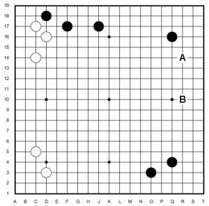 Quale direzione di approccio scegliere? Qui dobbiamo vedere quanto potenziale di sviluppo c’e’ dopo. Se giocassi in O17 avrei vicino le pietre nere a sinistra quindi e’ meglio l’altra parte, adesso di questa spiaggia abbiamo scelto la zona piu’ libera. Ora dipende dai gusti, A mira a prendere o ridurre l’angolo mentre B occupa un punto strategico con diversi sviluppi.