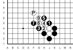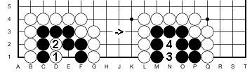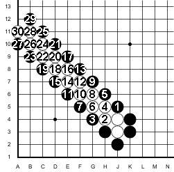 Bianco estende per aumentare le proprie liberta’ ma nero e’ sempre in grado di tenerlo in atari fino al bordo del goban.